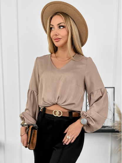 Elegancka bluzka z dekoltem w serek. Długie rękawki zakończone zostały gumką.  Idealna zarówno na formalne okazje jak i do codziennych stylizacji. Romantyczny charakter nadaje delikatny bufiasty fason od połowy rękawa. Wykonana z miękkiego, przyjemnego materiału.