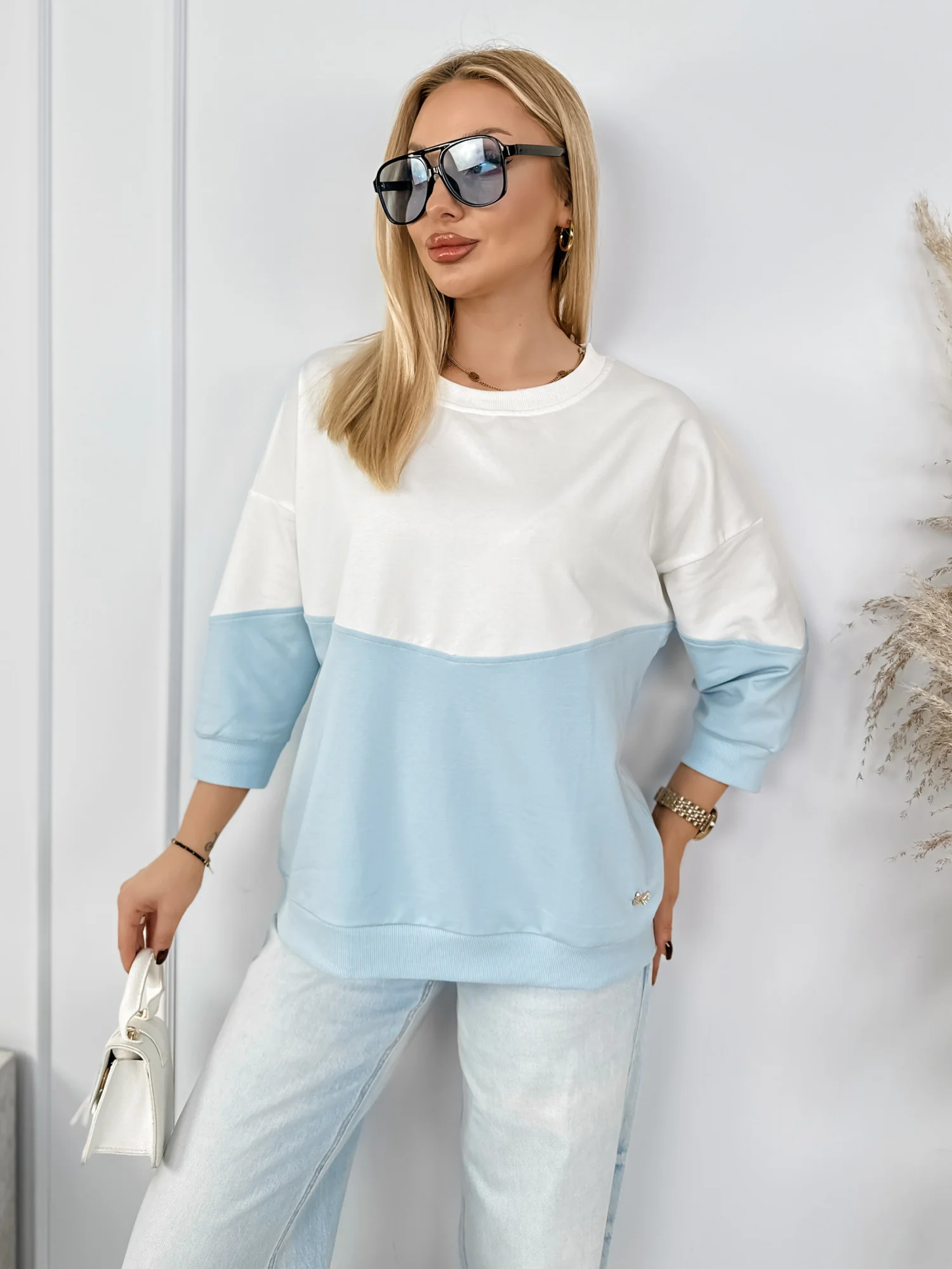 Dwukolorowa bluzka, która świetnie wkomponuje się do Twojej stylizacji. Wykonana z przyjemnej bawełny. Wykończona ściągaczami. Na dole bluzy, na przodzie przyszyta została subtelna broszka. Oryginalnym aspektem jest wycięcie na plecach.