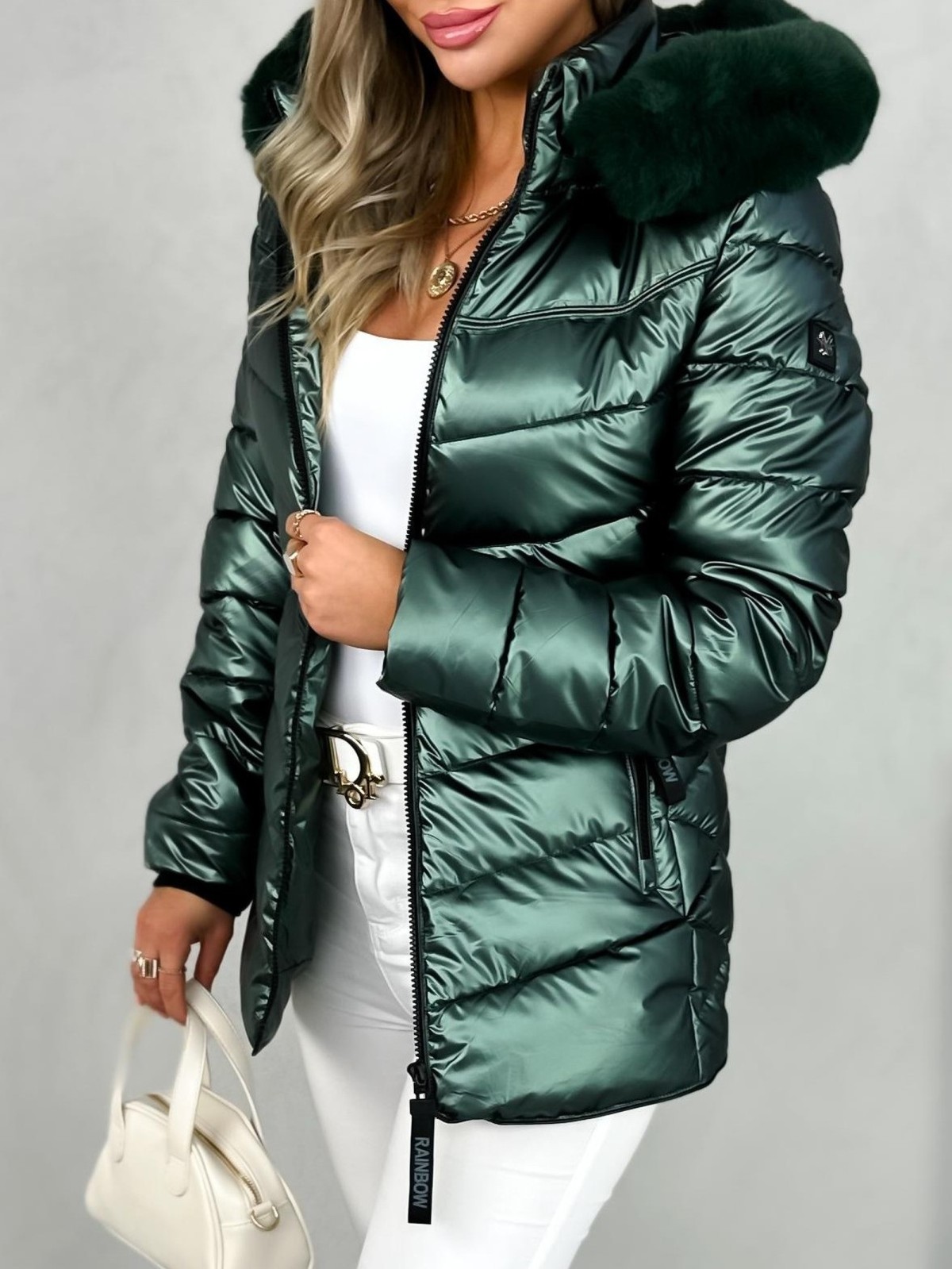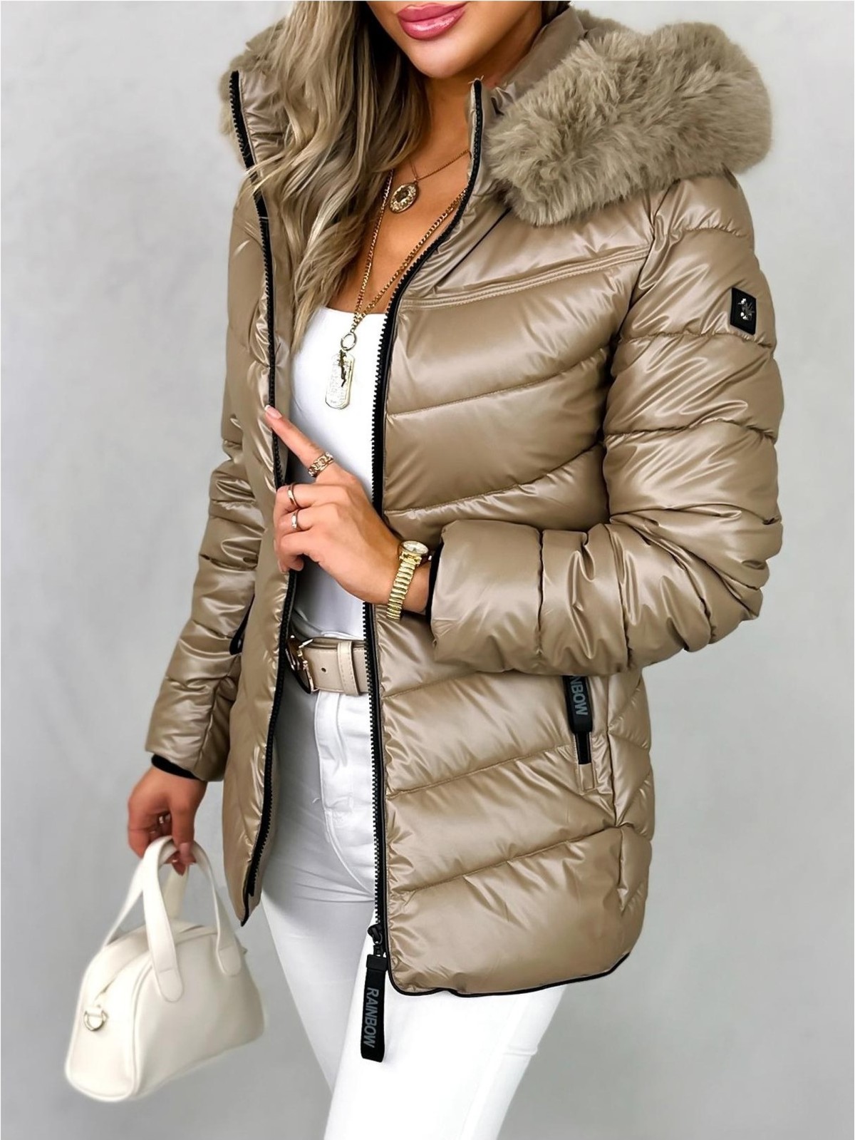 Wyjątkowa pikowana kurtka z kapturem zdobionym pięknym futerkiem. Zarówno kaptur jak i futerko można odpinać. Kurtka zapinana jest na zamek, po bokach ma ozdobne rozcięcia. Rękawy wykończone są ściągaczem. Kurtka jest ocieplana. Materiał nie jest elastyczny.