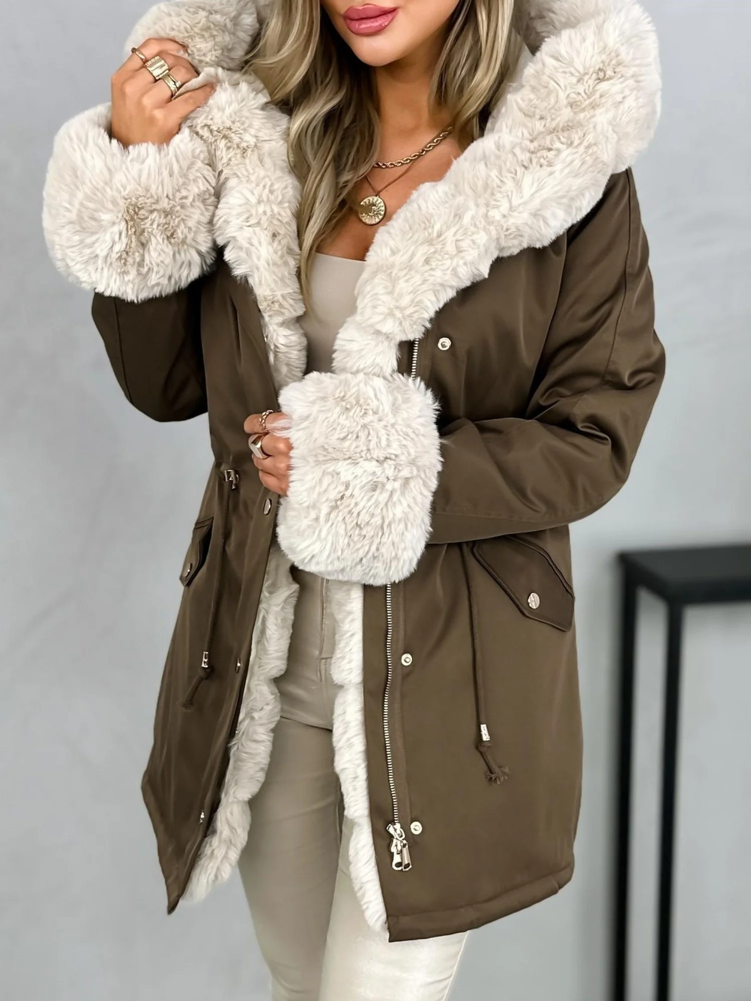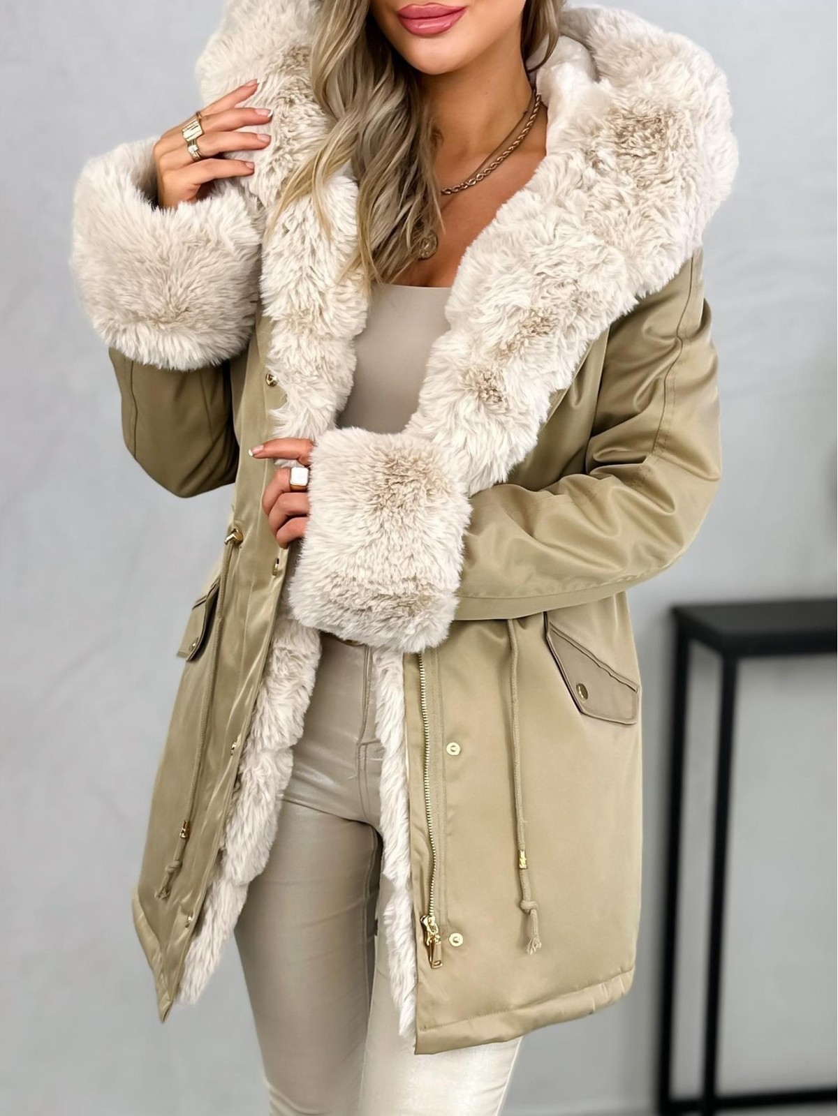 Kurtka ocieplana od środka futerkiem, zapinana na zamek (rozpina się też od dołu) i napy, regulowana w talii. Posiada kaptur z odpinanym futerkiem i wpuszczane kieszenie przykryte patką. Rękawki wykończone są futerkiem, które można odpinać. Kurtka z tyłu u dołu posiada malutkie rozcięcie i sznureczek. Jest to modna i ponadczasowa propozycja na chłodne dni. Cieplutki materiał, mało elastyczny.