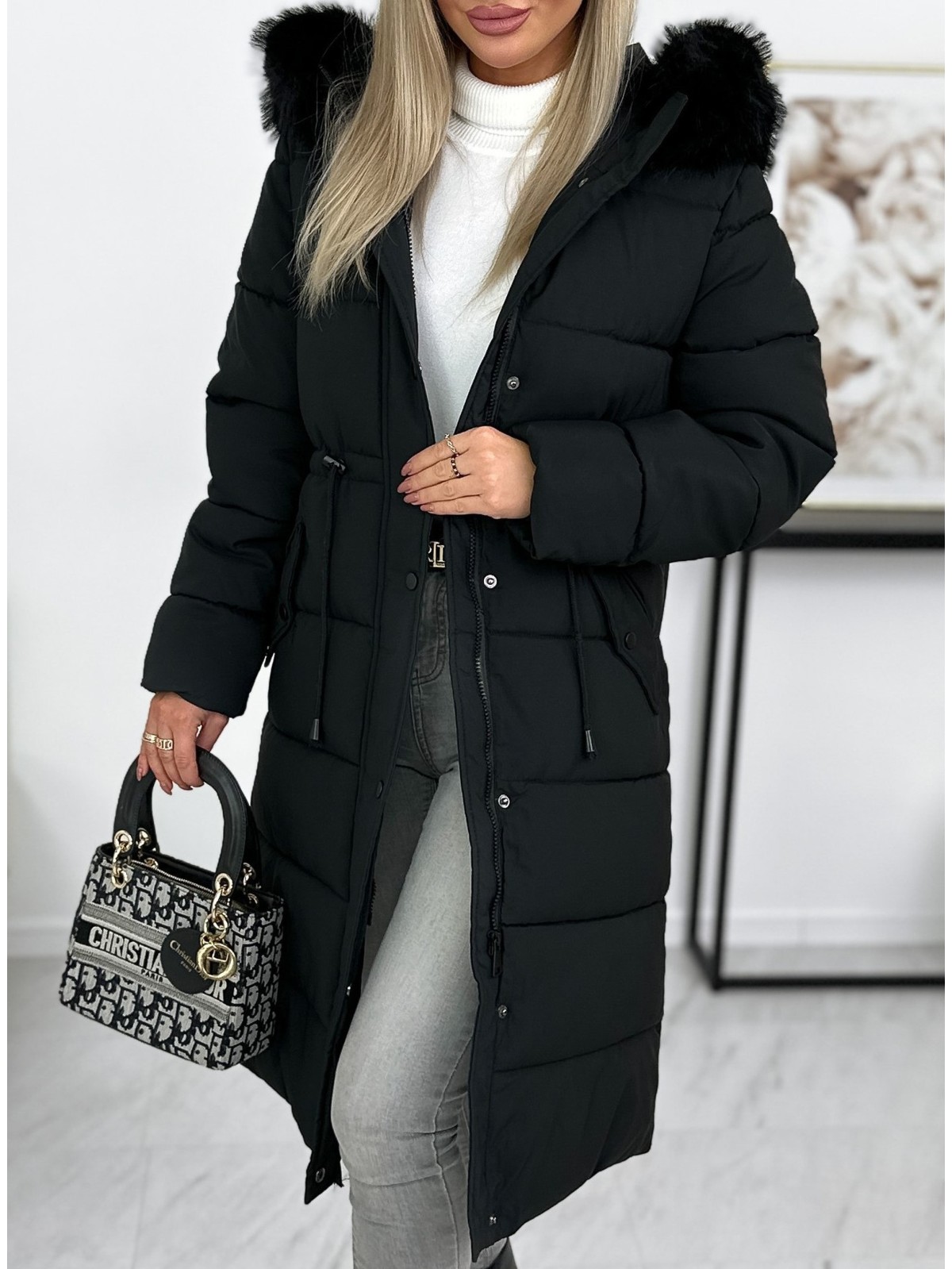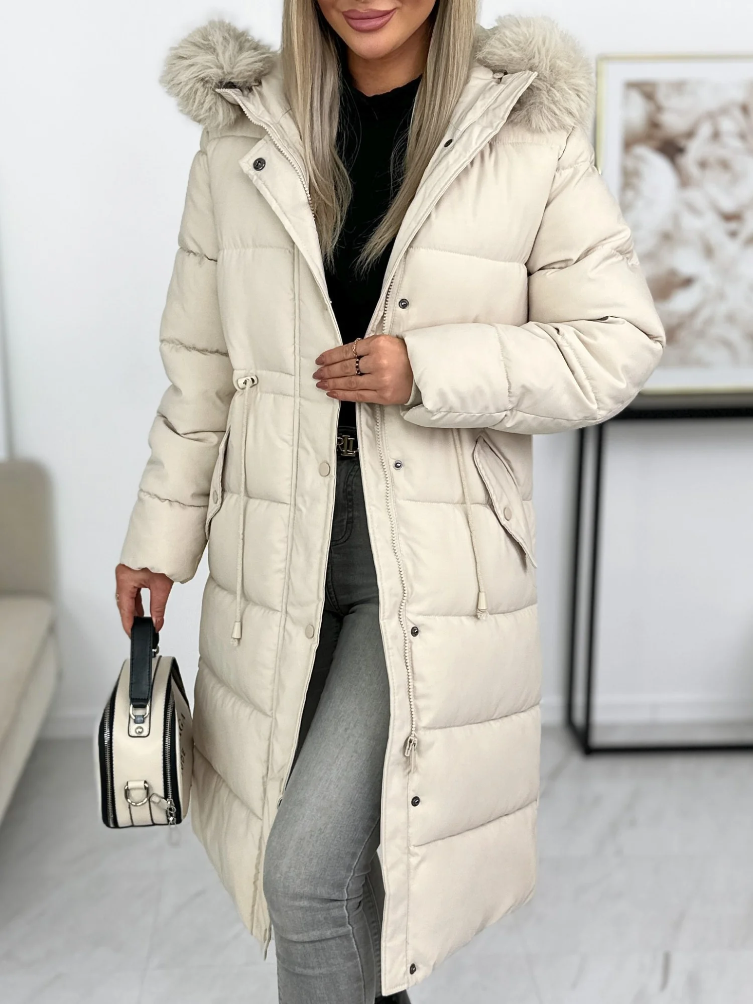 Długa, pikowana kurtka to idealna propozycja na mroźne dni. Model o dłuższym fasonie na podszewce, oceplany. Posiada kaptur z odpinanym futerkiem oraz funkcjonalne kieszenie z patką na napę. Kurtka jest zapinana na zamek oraz napy. W pasie posiada sznurek do regulacji, który podkreśli sylwetkę. Rękaw zakończony został od wewnątrz ściągaczem.