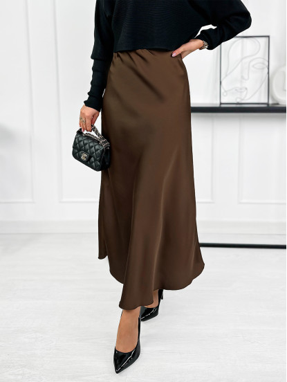 Najmodniejszy model w tym sezonie. Długa, satynowa spódnica. Model wykonany z przyjemnego, lejącego materiału. Posiada gumę w pasie, dzięki której świetnie dopasowuje się do sylwetki. Lekko rozkloszowany fason. Przepięknie układa się w ruchu.