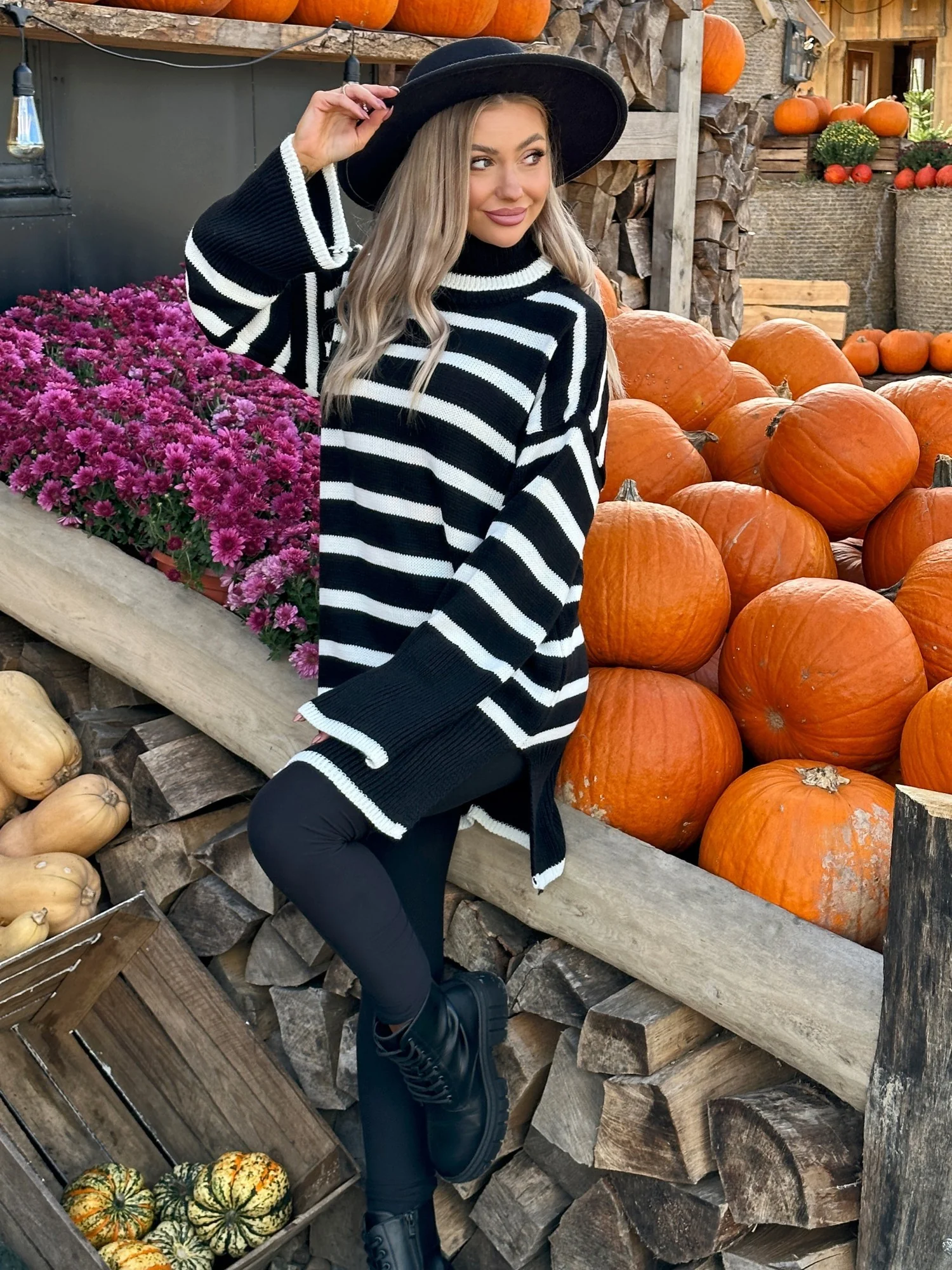 Stylowy sweterek z golfikiem o dłuższym kroju. Posiada rozkloszowane rękawki oraz rozcięcia po bokach. Modna kolorystyka oraz wzór w paski - to modowy hit! Świetnie sprawdzi się jako sukienka w połączeniu z kozaczkami, ale stworzy również piękny zestaw ze skórzanymi, dopasowanymi legginsami.
